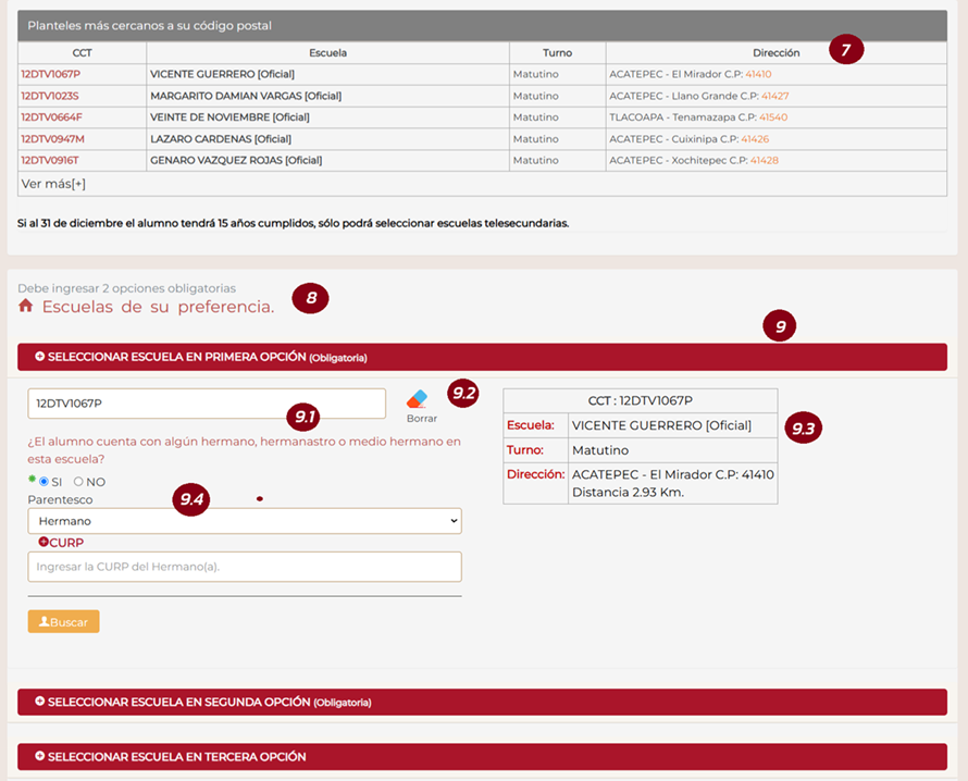 La sección de selección de escuelas brindará opciones al alumno, dependiendo si es un alumno de nuevo ingreso al sistema educativo estatal o si ya se encuentra cursando en Guerrero.