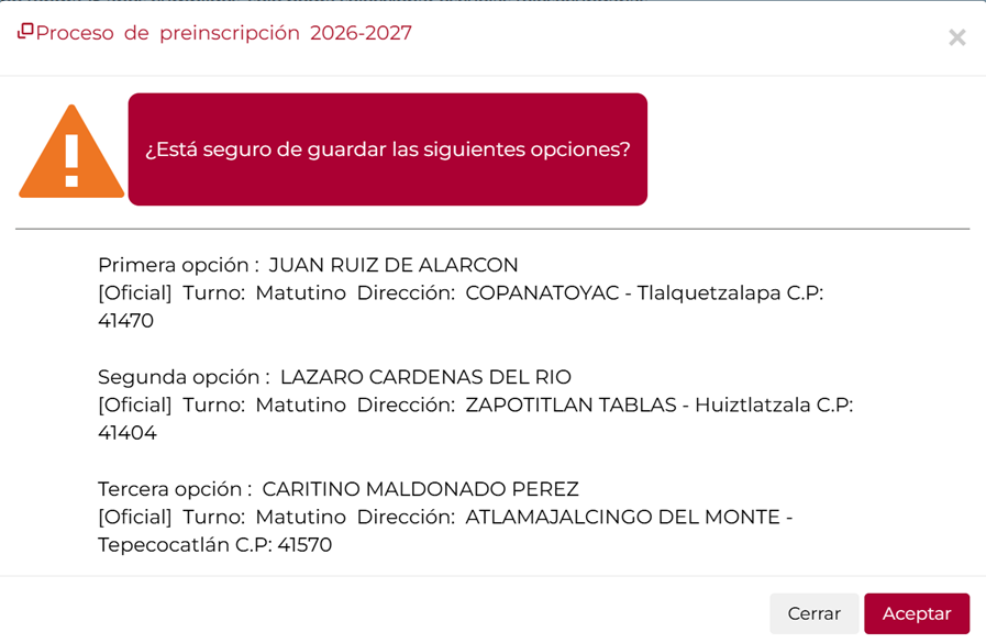 Para continuar con el proceso, se deberá pulsar el botón “Continuar”. El sistema mostrará una ventana emergente solicitando la confirmación con la(s) opción(es) seleccionadas. Si se desean modificar, seleccionar “Cerrar” para realizar las correcciones necesarias; caso contrario pulsar “Aceptar”.